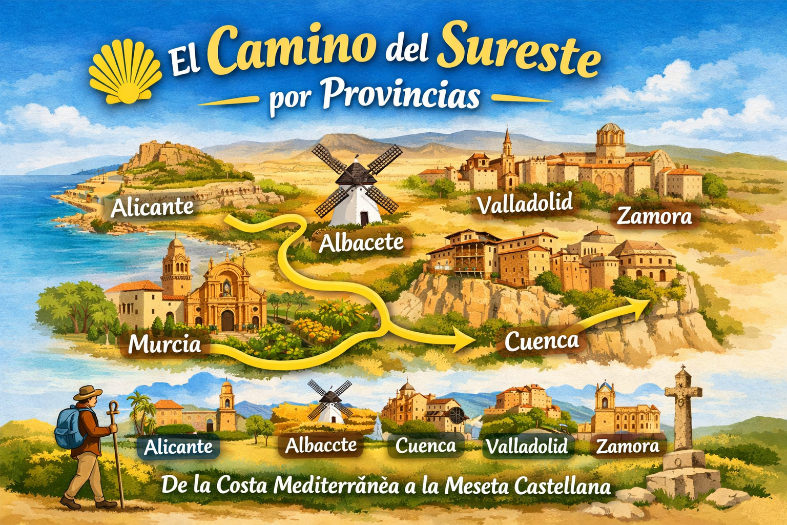 El Camino del Sureste atraviesa varias provincias de España desde que sale de Cartagena (Murcia) hasta llegar a Santiago de Compostela (A Coruña). Aquí tienes el recorrido completo por provincias, con las etapas que corresponden a cada una: