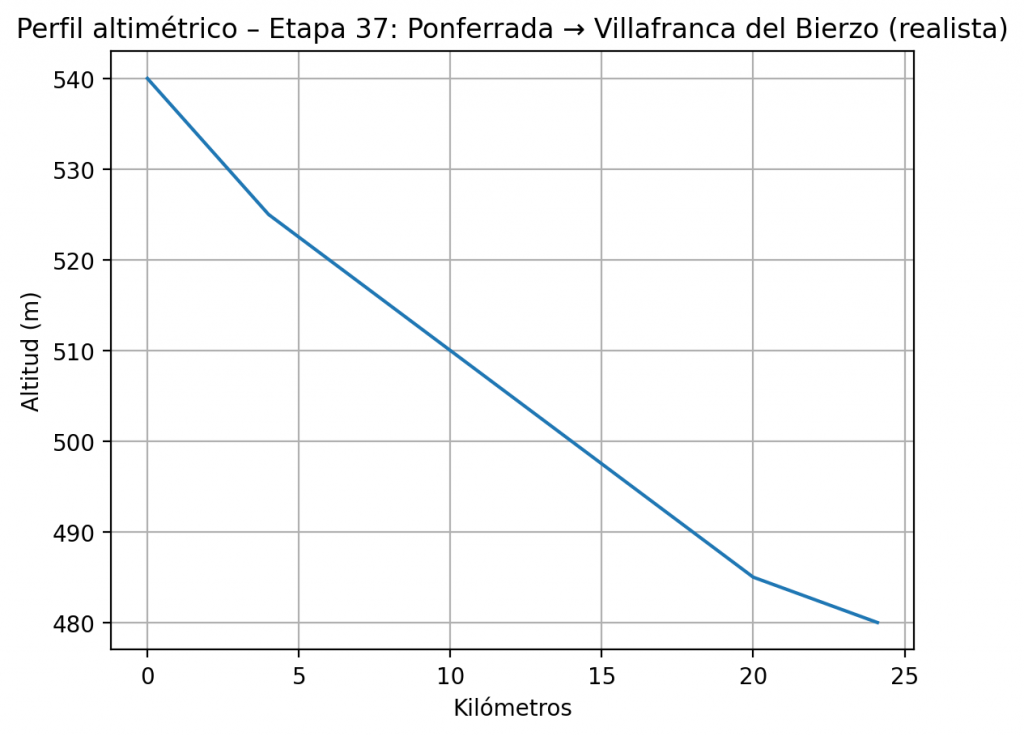 Etapa cómoda por el valle del Bierzo, con un ligero descenso progresivo y sin grandes dificultades técnicas. Jornada ideal para recuperar piernas antes de afrontar la exigente subida hacia O Cebreiro.