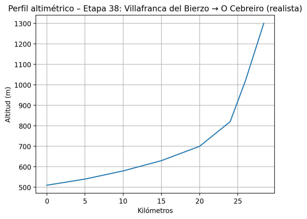 Etapa legendaria y muy exigente, con ascenso constante desde el Bierzo y una subida final dura hacia O Cebreiro. Aunque el desnivel se acumula poco a poco, el último tramo es el que más castiga, especialmente con calor o lluvia.