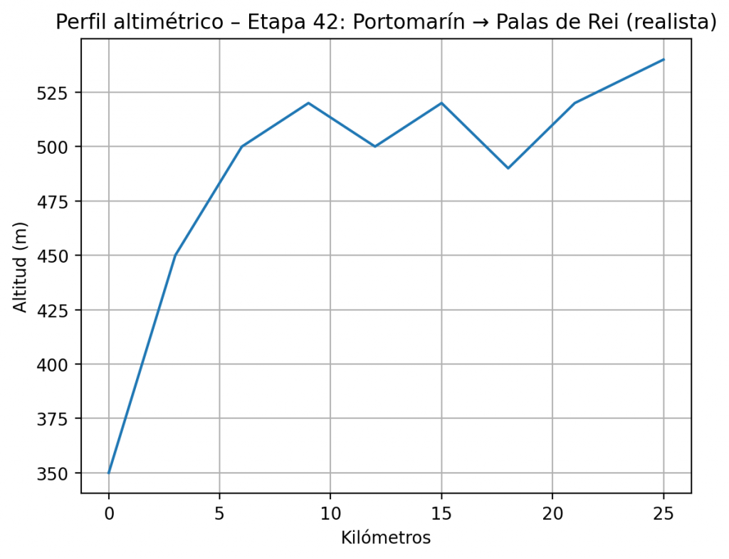 Etapa marcada por la fuerte subida nada más salir de Portomarín, tras la cual el recorrido continúa con constantes ondulaciones típicas del interior gallego. Jornada bonita, pero físicamente exigente por la acumulación de repechos.