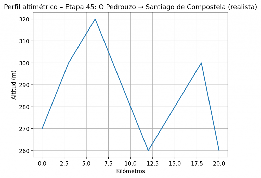 Última etapa del Camino, corta pero intensa. El recorrido alterna suaves subidas y bajadas típicas del paisaje gallego, con un último repecho antes de la entrada definitiva en Santiago de Compostela.